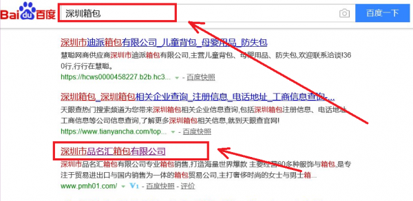 我們公司與深圳市品名匯箱包有限公司合作中,對這個公司所經營的箱包這個行業提供了百度快照排名,與該公司的合作,更多的客戶讓我們公司為其提供百度快照排名,通過每一次合作,我們公司不斷完善自己,同時希望合作伙伴在經營的路上越來越好。
