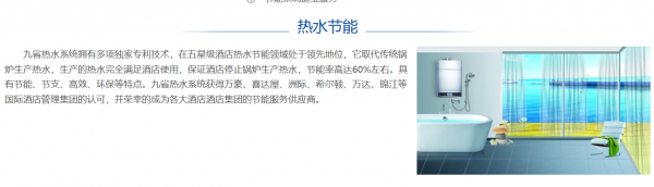 海南九省能源技術有限公司主要從事能源技術、節能技術的研究和開發;熱水節能設備、空調節能設備的安裝、維修及保養;能源合同管理的企業。定位于豪華五星級酒店的節能服務等,提供能源評估、節能方案設計、節能工程實施、合同能源管理、系統維護等全方位的專業服務。我公司獨立研發的“九省熱水系統”已獲得了多項專利,還先后獲得了科技部、省科技廳、能源局等相關部門的大力支持。九省系統技術在我國熱水節能行業中處于領先水平。公司是三亞市發改委、工業與信息化局節能服務部備案的節能服務企業,受到政府的大力推廣。目前我公司的九省系統獲得萬豪、喜達屋、洲際、希爾頓、萬達、錦江等國際酒店管理集團的認可,并榮幸的成為各大酒店酒店集團的節能服務供應商。我公司始終以滿足客戶的需求,成為客戶信賴的長期伙伴為宗旨。努力打造以專業的技術水平、頂級的服務質量、一流的經濟效益為目標的節能環保企業。