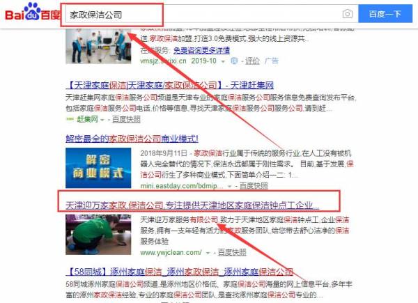我們公司與天津迎萬家家政服務有限公司合作中,對這個公司所經營的家政保潔這個行業提供了關鍵詞搜索排名,與該公司的合作,更多的客戶讓我們公司為其提供關鍵詞搜索排名,通過每一次合作,我們公司不斷完善自己,同時希望合作伙伴在經營的路上越來越好。