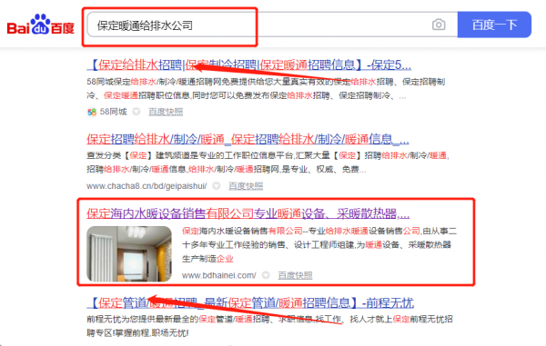 保定海*水暖設備銷售有限公司網站排名保證在首頁效果