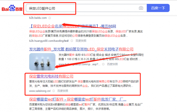 我們公司與保定雷*光電科技有限公司合作中,對這個公司所經營的LED配件這個行業提供了整站優化,與該公司的合作,更多的客戶讓我們公司為其提供百度快照排名,通過每一次合作,我們公司不斷完善自己,同時希望合作伙伴在經營的路上越來越好。