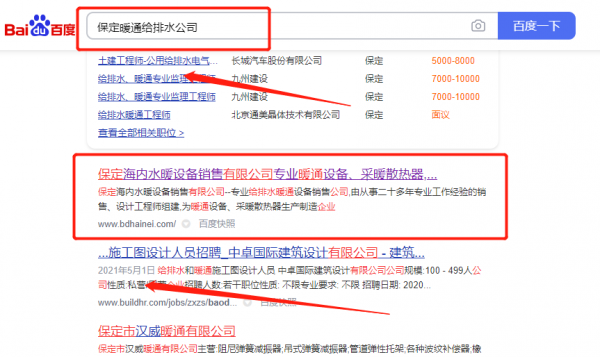 保定海*水暖設(shè)備銷售有限公司選用我司企業(yè)暖通給排水的網(wǎng)站優(yōu)化產(chǎn)品,其SEO關(guān)鍵詞有暖通給排水。通過反饋站點(diǎn)的客戶體驗(yàn)給搜索引擎,提升網(wǎng)站的關(guān)注度和友好度,從而達(dá)到關(guān)鍵字排名迅速提升的效果。多年上萬關(guān)鍵詞排名解決方案,且支持技術(shù)、售后有保障。保定海*水暖設(shè)備銷售有限公司成立于2009年,是經(jīng)保定市市場(chǎng)監(jiān)督管理局審核的有資質(zhì)的公司,其統(tǒng)一社會(huì)信用代碼:911306026**678165W。公司地址:河北省保定市新市區(qū)大車村268號(hào)。