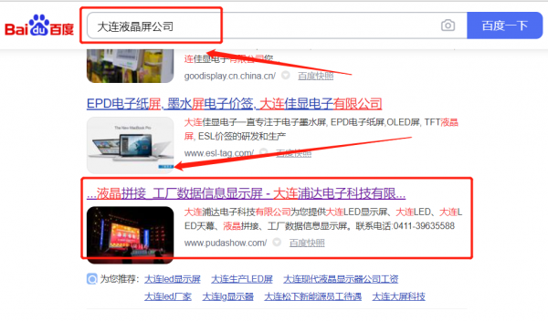 大連浦*電子科技有限公司選用我司企業液晶屏的網站優化產品,其SEO關鍵詞有液晶屏。搜索品牌詞,首頁至少霸占5條,通過營銷型網站、媒體文章、口碑等方式,達到全方位霸屏,全面展示企業實力。大連浦*電子科技有限公司成立于2016年,是經大連市市場監督管理局審核的有資質的公司,其統一社會信用代碼:91210204M**QDCR81Y。公司地址:遼寧省大連市沙河口區錦華南園17號2單元5層1號。
