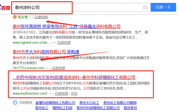 泰州市科研精細化工有限公司選用我司企業涂料行業的網站優化產品,其SEO關鍵詞有涂料。專注于網站建設與排名優化,只做優化型網站,正規網站推廣優化,排名上升速度快,排名穩定,效果達標率超95%,換位思考,提升用戶體驗的同時為企業帶來效益。泰州市科研精細化工有限公司成立于2001年,是經泰州市市場監督管理局審核的有資質的公司,其統一社會信用代碼:91321204729316149C。公司地址:江蘇省泰州市姜堰經濟開發區(化工園區)揚州路588號。