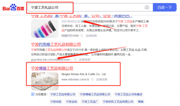 寧波博*工藝品有限公司選用我司企業(yè)工藝禮品行業(yè)的網(wǎng)站優(yōu)化產(chǎn)品,其SEO關(guān)鍵詞有工藝禮品。利用全新的SEO技術(shù),在短時間內(nèi)使關(guān)鍵詞占領(lǐng)搜索引擎首頁,為企業(yè)官網(wǎng)獲取更多更精準的流量。大數(shù)據(jù)分析,針對性定位,推廣,專屬定制最適合您,效果最全面的的推廣方案,更有效果保證!寧波博*工藝品有限公司成立于2002年,是經(jīng)寧波市市場監(jiān)督管理局審核的有資質(zhì)的公司,其統(tǒng)一社會信用代碼:91330201**232411XU。公司地址:浙江省寧波杭州灣新區(qū)圃源路19號。