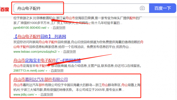 舟山市*利達汽車部件有限公司選用我司企業電子配件行業的網站優化產品,其SEO關鍵詞有電子配件。通過對搜索引擎目標關鍵詞優化,使目標網站的相關信息顯示在百度首頁,為企業挖掘更多的潛在客戶的同時帶來海量的商機。舟山市*利達汽車部件有限公司成立于2005年,是經舟山市市場監督管理局審核的有資質的公司,其統一社會信用代碼:91330921**31423341。公司地址:浙江省舟山市岱山縣東沙鎮余金工業區。