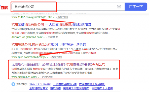 我們公司與杭州*昊紡織科技有限公司合作中,對這個公司所經營的墻紙這個行業提供了關鍵詞搜索排名,與該公司的合作,更多的客戶讓我們公司為其提供關鍵詞搜索排名,通過每一次合作,我們公司不斷完善自己,同時希望合作伙伴在經營的路上越來越好。