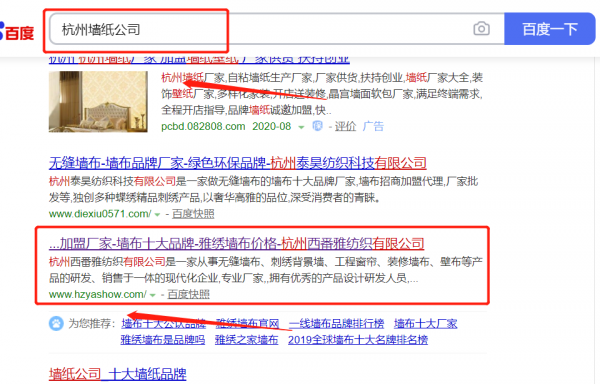我們公司與杭州*番雅紡織有限公司合作中,對這個公司所經(jīng)營的墻紙這個行業(yè)提供了關鍵詞搜索排名,與該公司的合作,更多的客戶讓我們公司為其提供關鍵詞搜索排名,通過每一次合作,我們公司不斷完善自己,同時希望合作伙伴在經(jīng)營的路上越來越好。