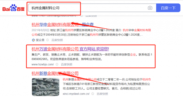 杭州*波金屬材料有限公司百度排名效果展示