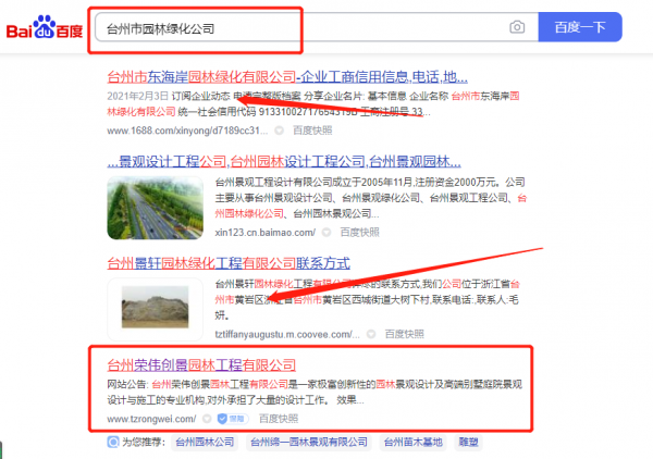 臺州榮*創景園林工程有限公司選用我司企業園林綠化的網站優化產品,其SEO關鍵詞有園林綠化。3-15天快速提升網站前五頁關鍵詞排名上百度首頁,幫助客戶增加流量,提高成交量,為您帶來更多潛在客戶,打造客戶品牌影響力。臺州榮*創景園林工程有限公司成立于2010年,是經臺州市市場監督管理局審核的有資質的公司,其統一社會信用代碼:913310025**372092T。公司地址:浙江省臺州市椒江區光明路2號。