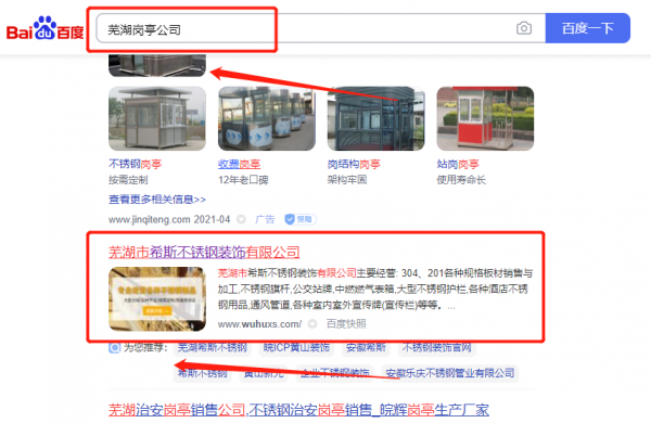蕪湖市希*不銹鋼裝飾有限公司選用我司企業崗亭的網站優化產品,其SEO關鍵詞有崗亭。專家1對1的定制解決方案,篩選的關鍵字40-60天就能排名上去。若沒有達到效果,除服務費全部退還,讓企業無后顧之憂。蕪湖市希*不銹鋼裝飾有限公司成立于2010年,是經蕪湖市市場監督管理局審核的有資質的公司,其統一社會信用代碼:913402005**810879X。公司地址:安徽省蕪湖市黃山西路皖江水產批發市場綜合樓D15號。