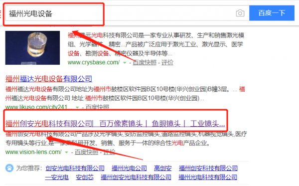 我們公司與福州創安光電科技有限公司合作中,對這個公司所經營的光電設備這個行業提供了百度快照排名,與該公司的合作,更多的客戶讓我們公司為其提供百度快照排名,通過每一次合作,我們公司不斷完善自己,同時希望合作伙伴在經營的路上越來越好。