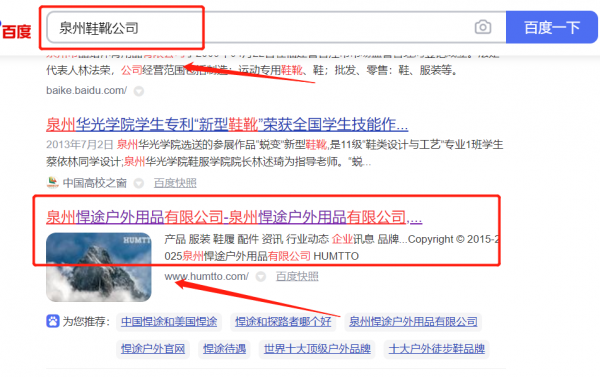 我們公司與泉州*途戶外用品有限公司合作中,對這個公司所經營的鞋靴這個行業提供了SEO,與該公司的合作,更多的客戶讓我們公司為其提供搜索引擎優化推廣,通過每一次合作,我們公司不斷完善自己,同時希望合作伙伴在經營的路上越來越好。