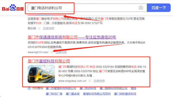我們公司與廈門市星*科技有限公司合作中,對這個公司所經營的電話對講機這個行業提供了快速排名,與該公司的合作,更多的客戶讓我們公司為其提供SEO優化,通過每一次合作,我們公司不斷完善自己,同時希望合作伙伴在經營的路上越來越好。