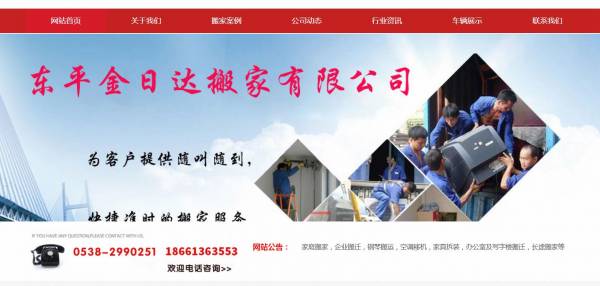東平金*達搬家有限公司選用我司企業跑腿行業的網站優化產品,其SEO關鍵詞有 東平搬家,東平搬家公司,東平家庭搬家,東平企業搬遷,東平板式家具拆裝,東平長途搬運,東平大型公司搬遷,東平空調移機,東平鋼琴搬運,東平搬家公司電話,東平奇石搬運,東平家具拆裝,東平太陽能移機,東平熱水器移機,東平清洗油煙機,東平金*達搬家有限公司。其特點是用很合適的展示方式、展示效果、站點框架,把客戶及其用戶很關心的問題突出表現;并以簡潔明朗的設計風格,清晰展現公司水平實力,確保一秒抓住目標用戶眼球,給用戶留下良好的第一印象。東平金*達搬家有限公司成立于1996年,是經東平市市場監督管理局審核的有資質的公司,其統一社會信用代碼:91370923**6648181K。公司地址:東平縣平湖路與汶河街交匯處