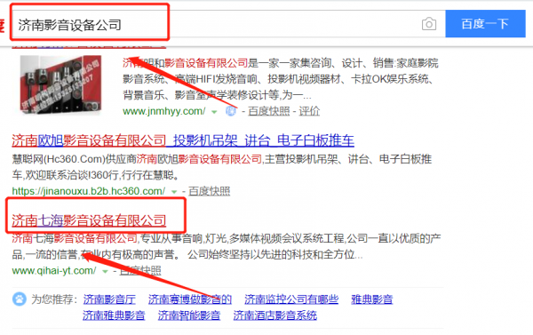 我們公司與濟(jì)南七海影音設(shè)備有限公司合作中,對(duì)這個(gè)公司所經(jīng)營(yíng)的影音設(shè)備這個(gè)行業(yè)提供了百度快照排名,與該公司的合作,更多的客戶讓我們公司為其提供百度快照排名,通過(guò)每一次合作,我們公司不斷完善自己,同時(shí)希望合作伙伴在經(jīng)營(yíng)的路上越來(lái)越好。