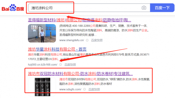 濰坊市雙*防水材料有限公司選用我司企業涂料的網站優化產品,其SEO關鍵詞有涂料。專家1對1的定制解決方案,篩選的關鍵字40-60天就能排名上去。若沒有達到效果,除服務費全部退還,讓企業無后顧之憂。濰坊市雙*防水材料有限公司成立于2006年,是經濰坊市市場監督管理局審核的有資質的公司,其統一社會信用代碼:913707837**494579Y。公司地址:山東省濰坊市壽光市臺頭鎮東莊村。