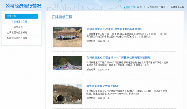 公司自創立起始終堅持“建一個工程,樹一個品牌”的質量管理理念和“以人為本,安全第一”的安全生產理念,把工作貫穿到工程施工的每一個細節,做到制度健全、組織有序、措施到位。憑借豐富的工程施工經驗和專業的技術能力,以隧道工程為龍頭業務,廣泛涉足鐵路、公路、橋梁建設、房屋建筑、市政建設等多個領域。先后承建了國內外20多個項目,其中包括多個國家重點項目。既往施工項目有:銀川濱海新區旅游大道改造項目、十堰市地下綜合管廊PPP項目,夏成高速湖南汝城段隧道,隧道總長2400米;貴昆高鐵昆明南站段,隧道總長8000米;桃巴高速巴中段,隧道總長2500米;廣西桂林桂柳高速三睦隧道,云南昆明昆楚高速法堂寺1#隧道進口段;及國外的格魯吉亞現代化鐵路項目中承建的T7隧道、T8隧道、T9隧道、T11隧道、格魯吉亞E60高速公路項目F3標段2#、3#隧道。其中格魯吉亞現代化鐵路項目中的T9隧道為該國的重點控制性工程,全長8.3公里,是格魯吉亞國內目前最長的隧道,自出口段單向掘進長達5326米,在我國同類單線鐵路隧道施工中亦屬首創。此項目得到了國內外相關領導的高度認可和稱贊,取得了良好經濟效益和社會信譽。