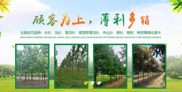 主要經(jīng)營(yíng)品種:水杉、池衫、落羽杉、墨西哥落羽杉、中山杉、柳杉、柳樹(shù)、楊樹(shù)等綠化苗木,產(chǎn)業(yè)銷(xiāo)售到了湖北、四川、重慶、廣東、江蘇、上海、浙江、福建、河南、安徽、貴州等地,不同規(guī)格,應(yīng)有盡有。